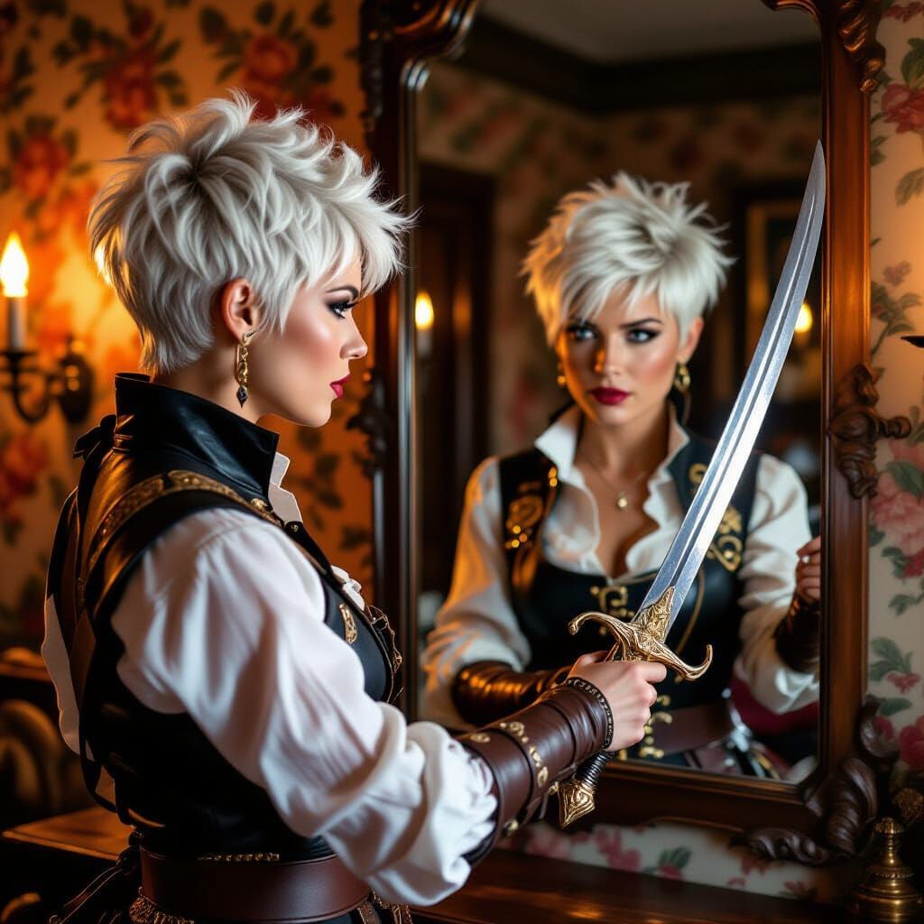 A gorgeous pirate woman with a pixie cut practices sword fighting while looking into a mirror in an elegant English manor setting.