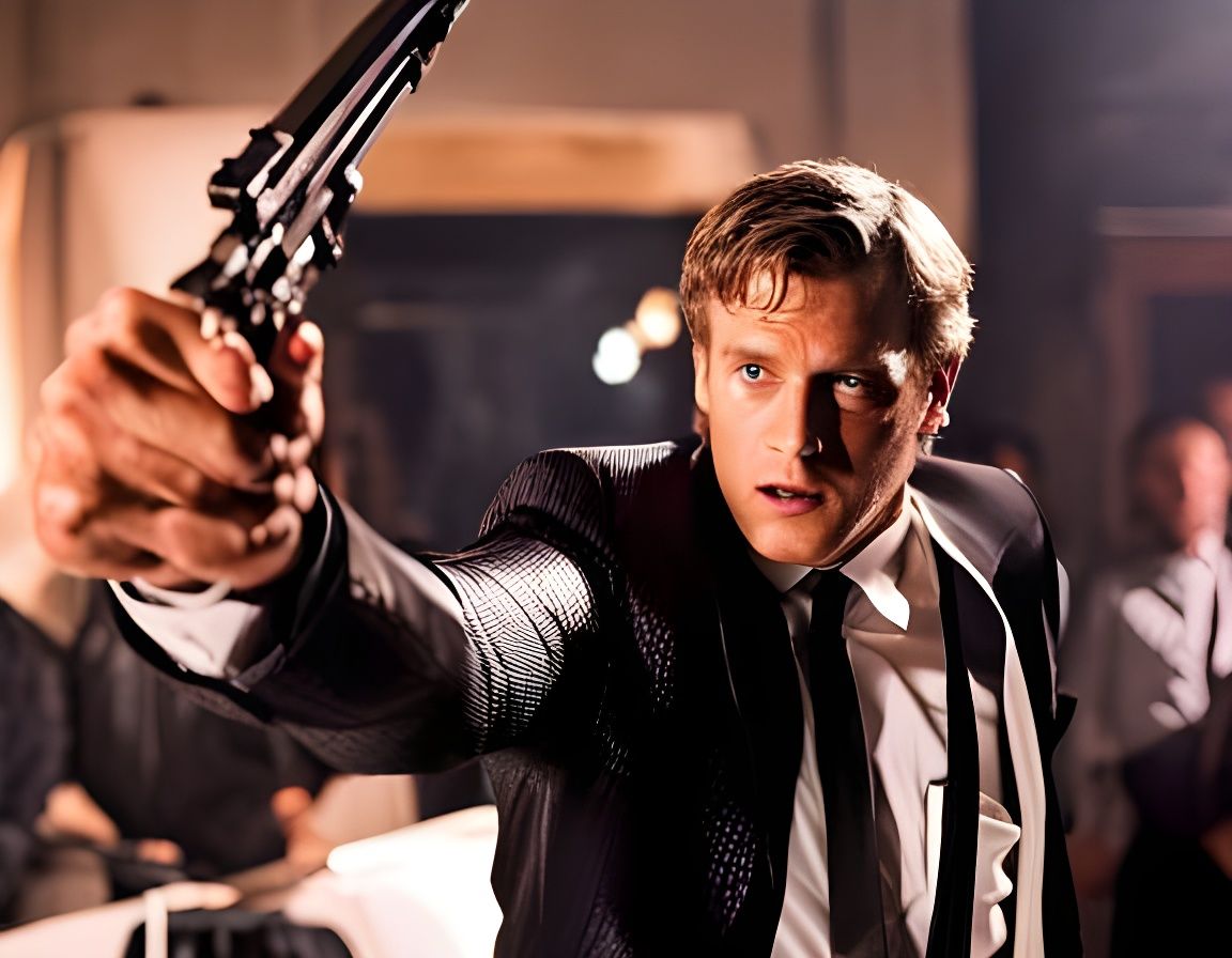 This image shows a hyperrealistic movie still of characters reminiscent of Reservoir Dogs. The scene is richly detailed with sharp focus and high contrast, creating a cinematic and moody atmosphere.