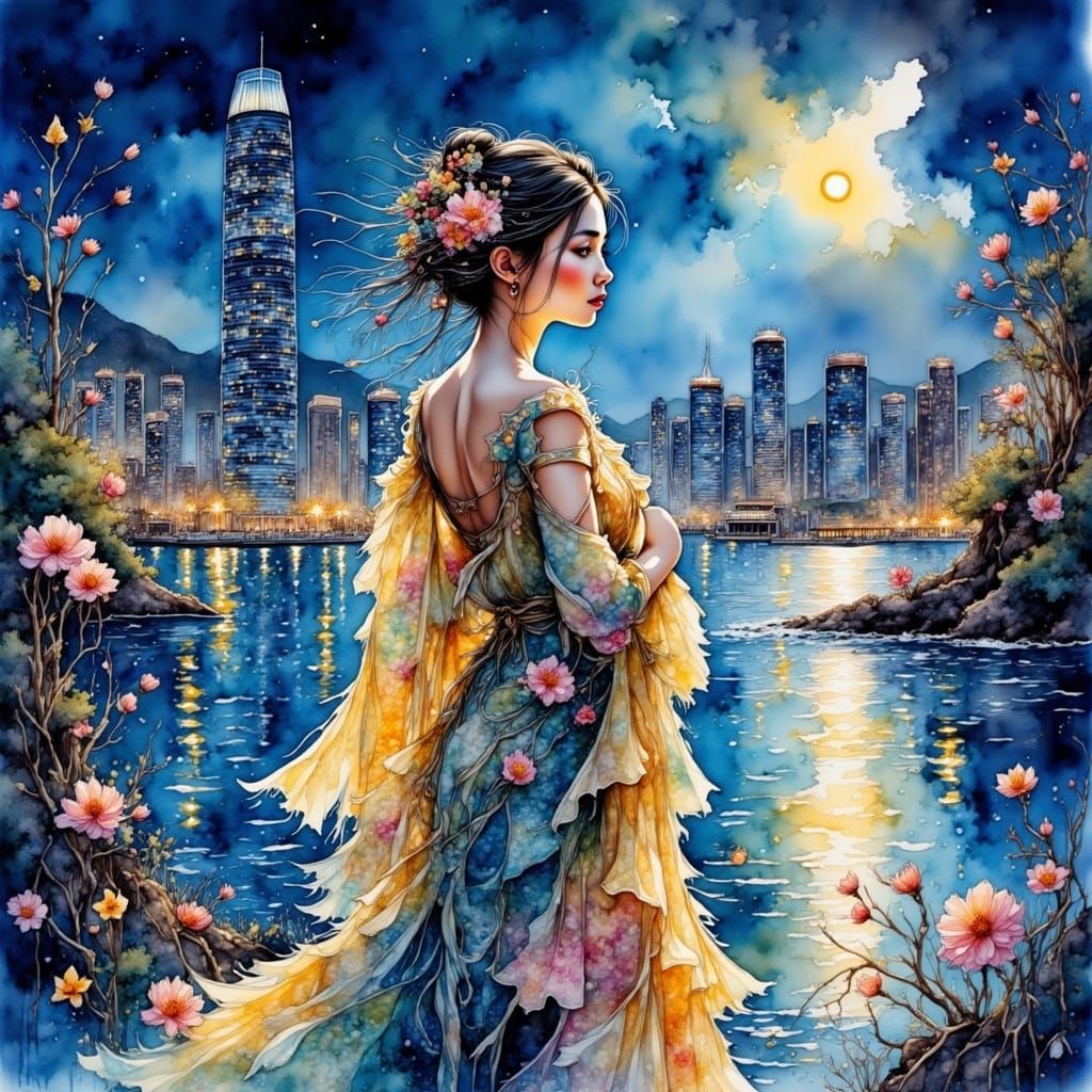A watercolor painting shows a woman in traditional dress at the edge of Hong Kong harbor at midnight. Reflected lights create a whimsical, magical scene in deep blues and gold.
