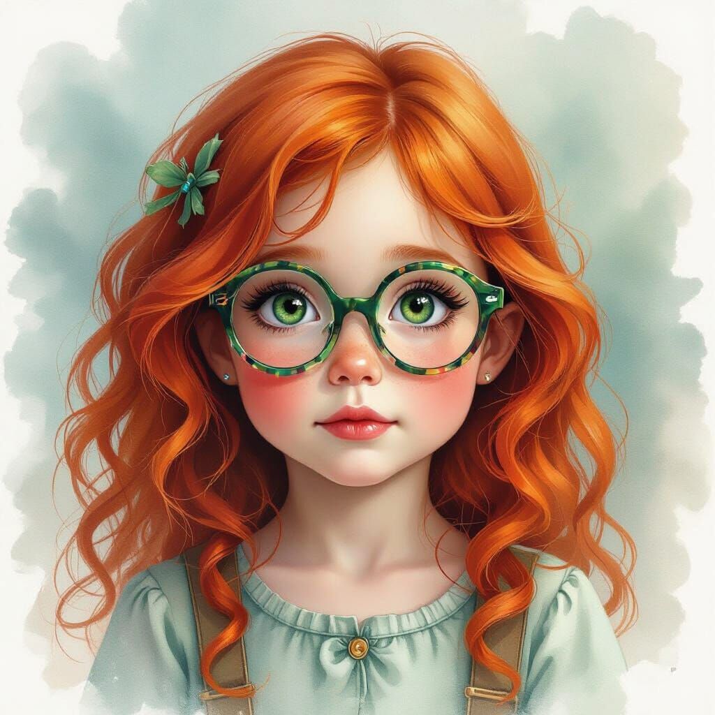 This image shows a young girl with unique glasses and vibrant red hair, her big green eyes drawing the viewer in. The background is a dreamy watercolor fantasy art.
