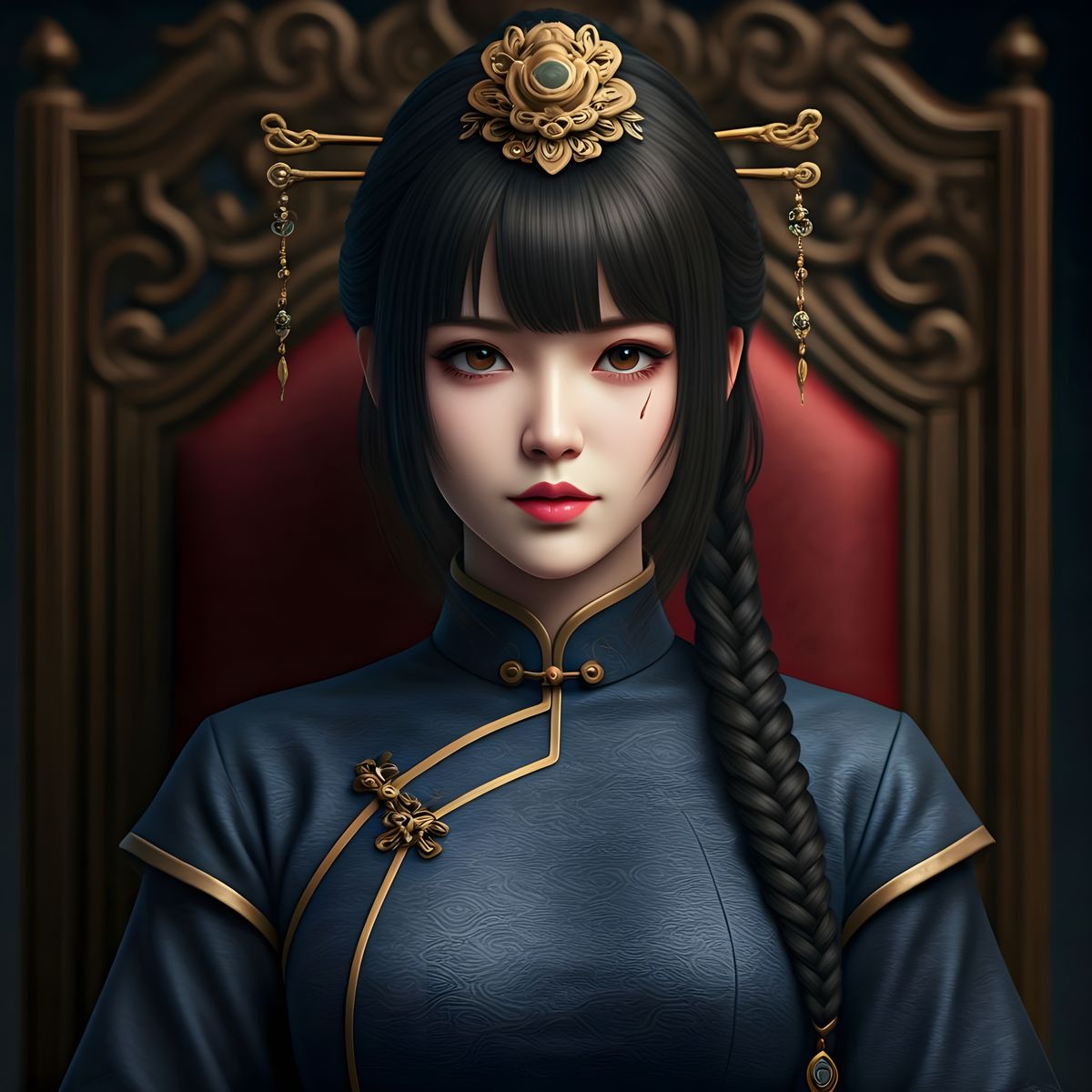 A stunning Chinese princess in an elegant dark blue qipao, seated on a throne. Features striking geisha goth makeup and a golden headdress, rendered in detailed 3D anime art.