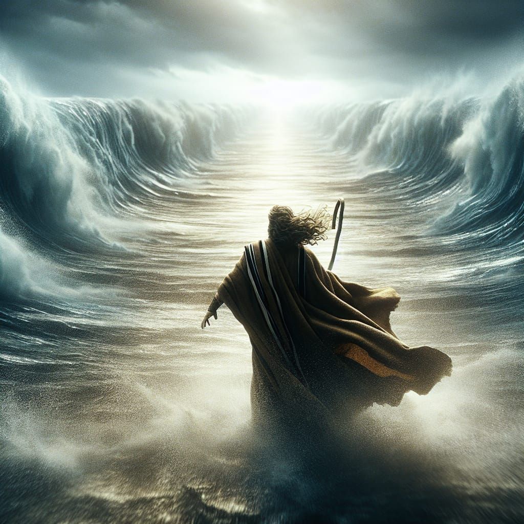 This image depicts Moses parting the Red Sea in a dramatic, cinematic style. The scene captures the awe and tension of the biblical event with high resolution and sharp focus.