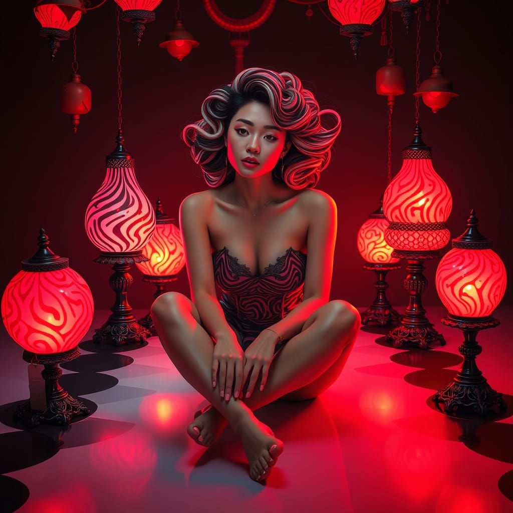 A mysterious woman sits in a dreamlike scene surrounded by vibrant, surreal ornaments and neon-lit accents, exuding an air of quiet contemplation.