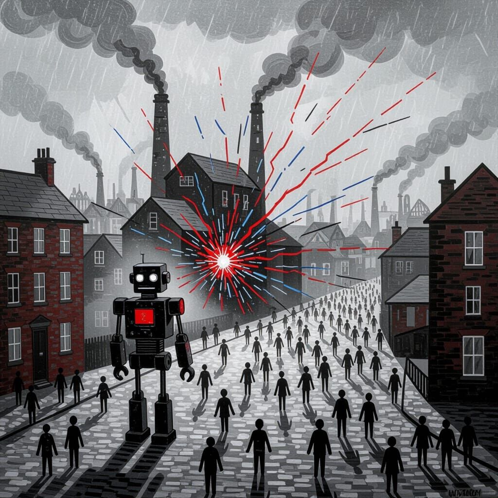 A robot approaches a Lancashire mill town filled with matchstick people. A storm unleashes dark electrical sparks across the black and white, misty, grey scene.