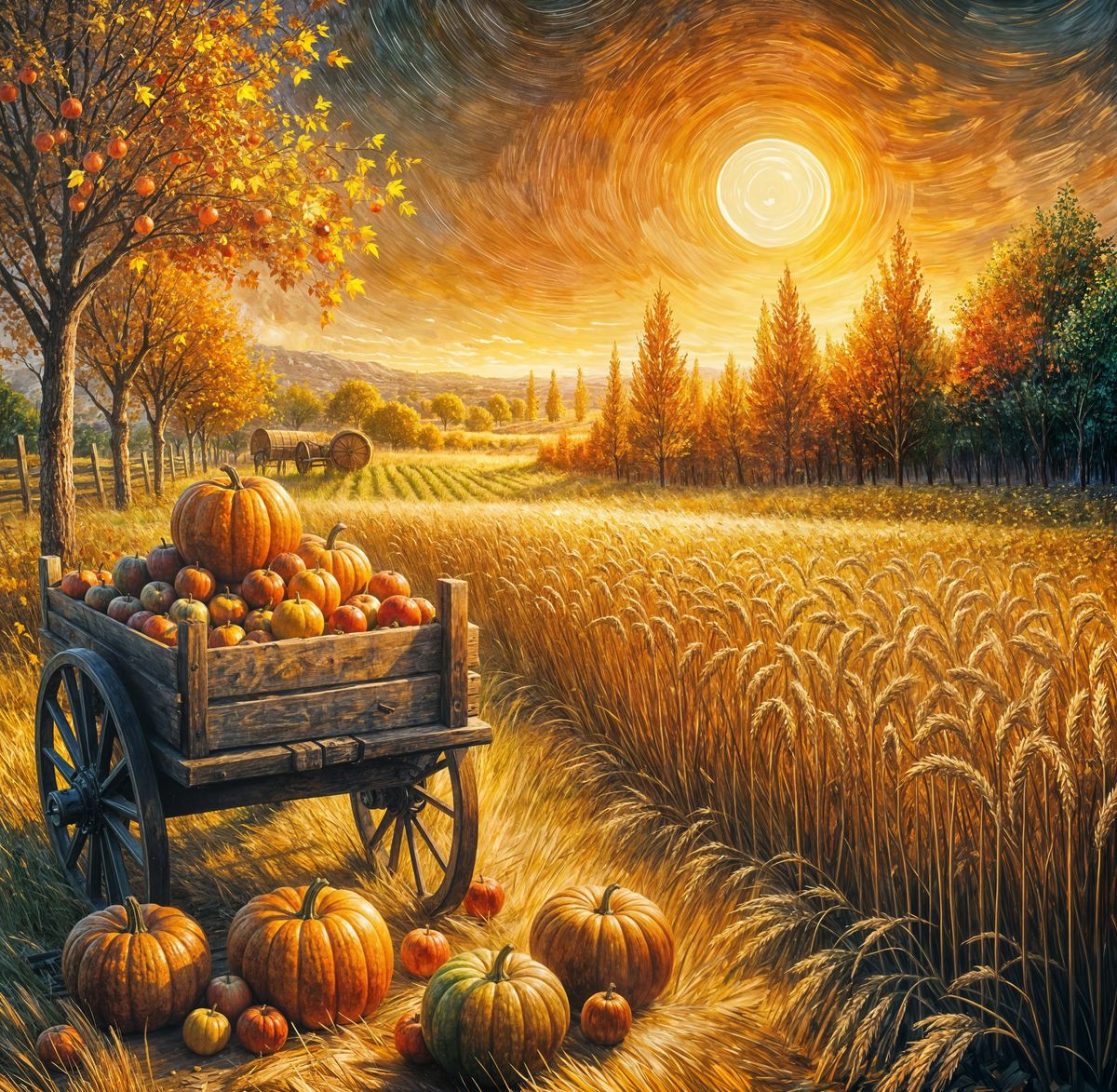 A vibrant scene of an autumn harvest with golden wheat fields under a warm, setting sun. Pumpkins and ripe apples are piled high in a rustic wooden cart. The scene is bathed in the soft, ethereal glow of golden hour, casting long shadows and highlighting the rich, earthy tones of the landscape. Rendered ...