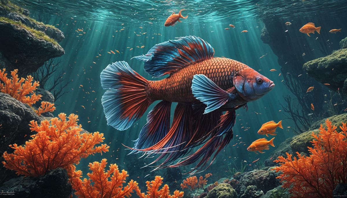 A vibrant Siamese fighting fish swims among colorful corals. This splash art style image features intricate textures and dramatic side lighting, showcasing a hyperrealistic and colorful underwater scene in 8K HD.