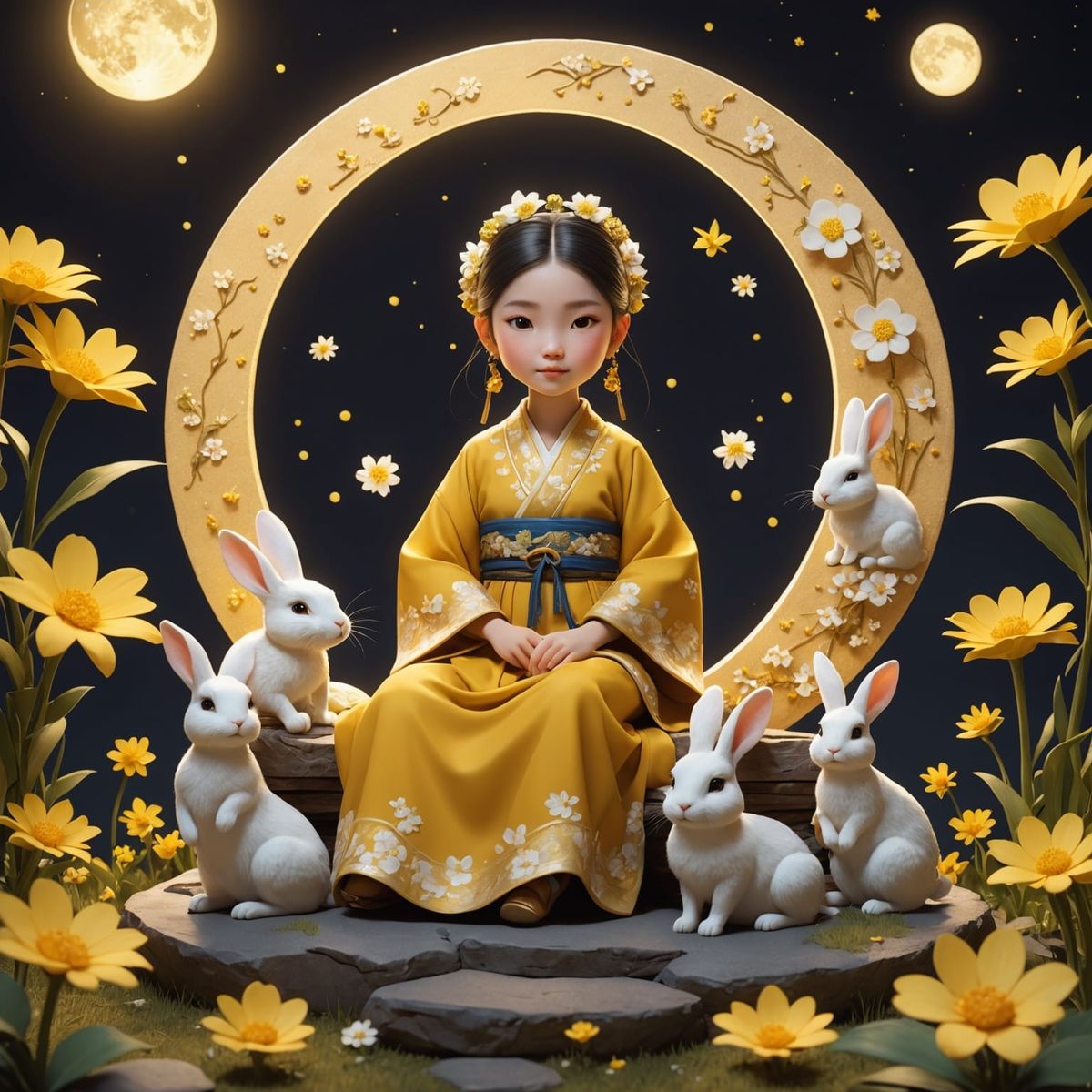 This image shows a 3D render of a girl in Hanfu sitting on the moon. Rabbits and white flowers surround her, bathed in a yellow sunset light. The digital artwork is highly detailed.
