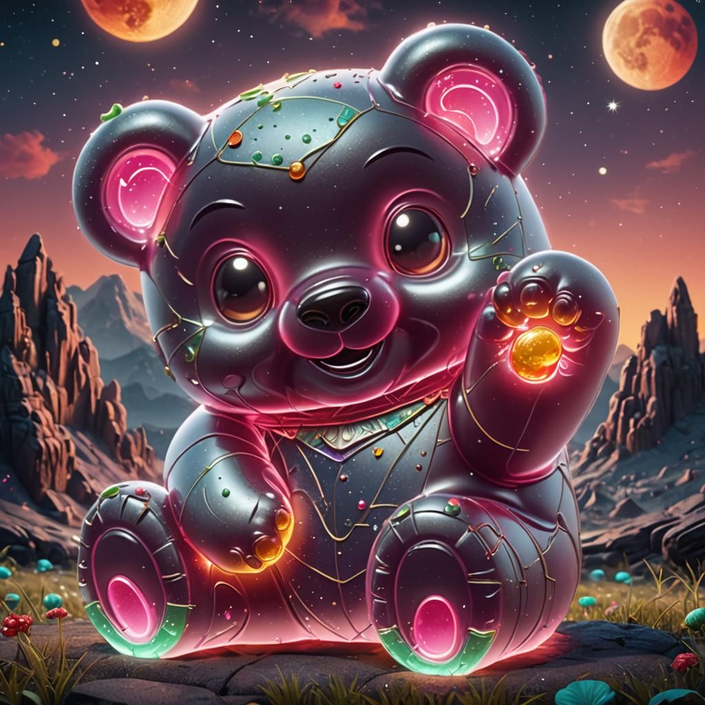 This image shows a gummy bear floating near the moon. The scene is rendered with deep colors and intricate details, in a fantasy art style.