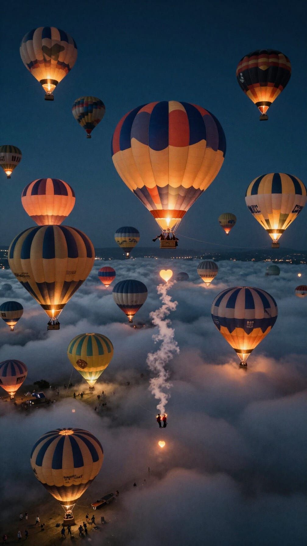 A breathtaking aerial view captures a vibrant night festival with numerous hot air balloons ascending over a cloud sea. Riders release glowing art pieces, symbolizing unity and gratitude, in this cinematic masterpiece.