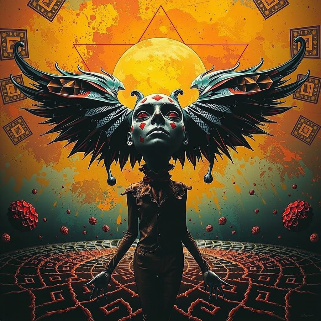 A vivid image of a harlequin figure camouflaged in a hypnotic geometric maze. The photorealistic piece features sharp details and a high-resolution color palette of vermillion, yellow, green, blue, and violet.