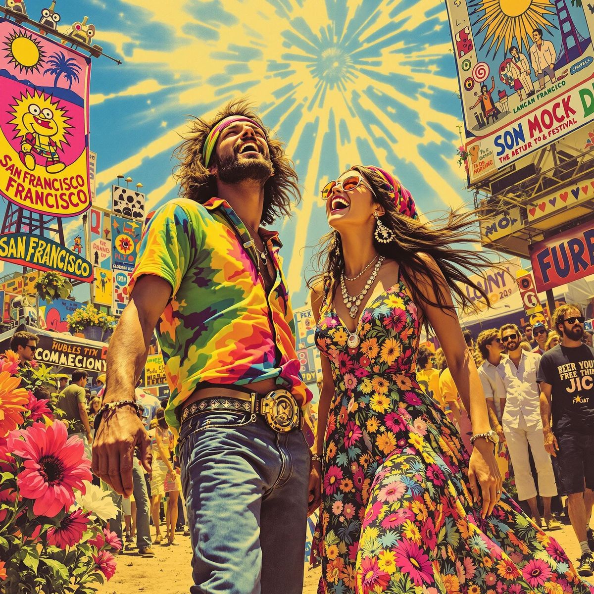 This vibrant image captures a carefree couple lost in the music, surrounded by psychedelic posters, colorful flowers, and a lively crowd of fellow hippies, blending the bold colors and patterns of Peter Max with the playful energy of Keith Haring and the dreamy quality of Roger Dean's art