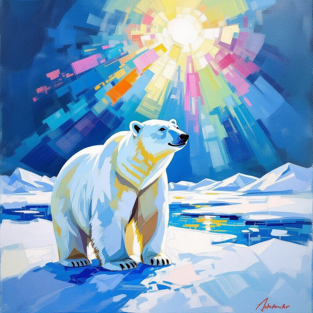 A vibrant image of a polar bear in an icy landscape. The artwork features thick brush strokes and impasto texture, reminiscent of impressionist masterpieces, rendered in layered gouache watercolors.