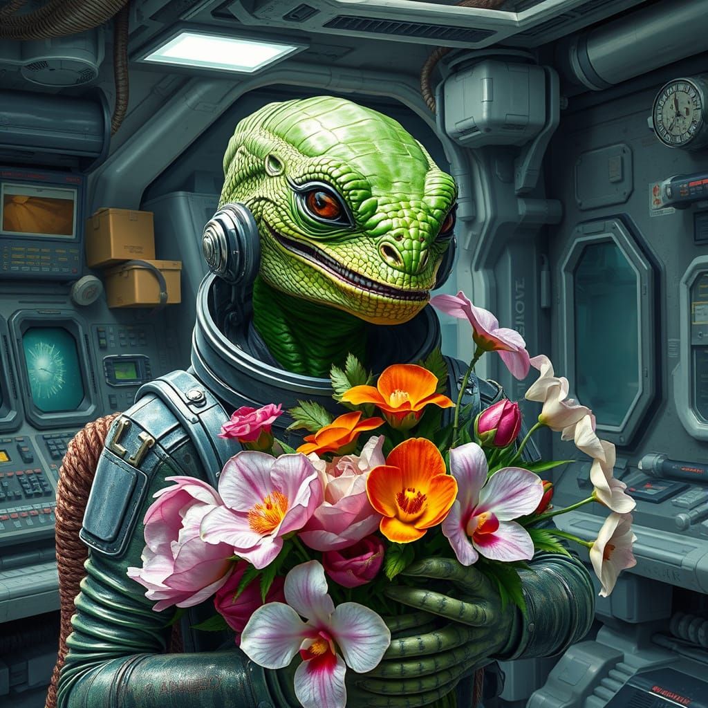 Photo Realistic. Green Humanoid Lizard Alien in a spacesuit without a helmet is holding and eating a vibrant bouquet of exotic flowers, including lush peonies and delicate orchids. Background is a control room on a space station. Use meticulous attention to detail and texture.