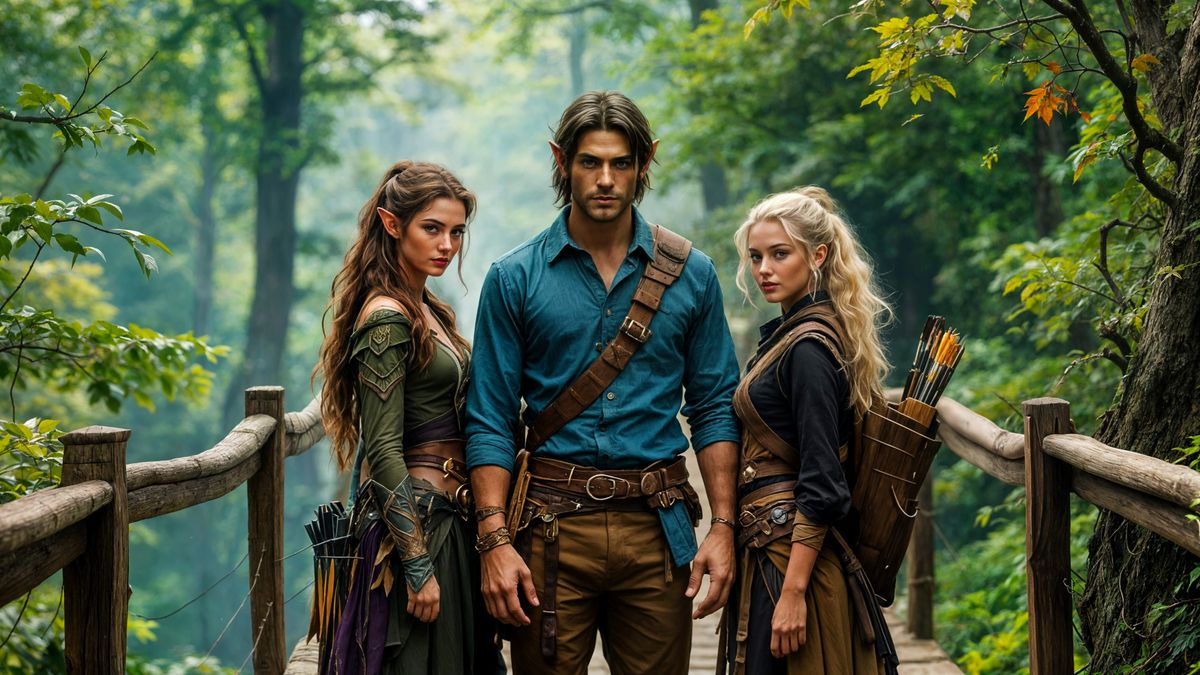 A stunning female wood elf stands alongside a human companion on a majestic wooden walkway amidst the vibrant, misty atmosphere of an elven forest, set amidst a fantasy realm with intricate details and ethereal beauty.