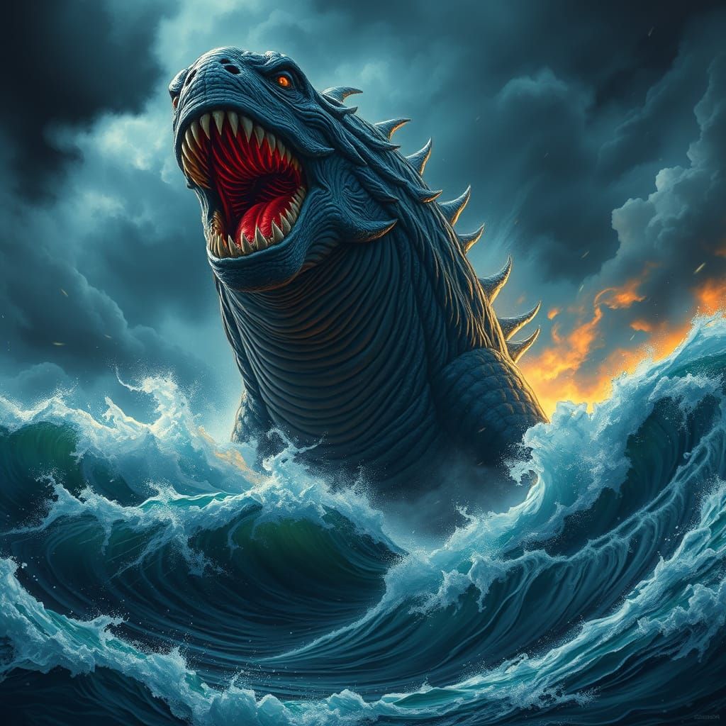 A striking picture of a gigantic sea monster rising from a raging typhoon. This digital painting showcases intricate details, vibrant complementary colors, and dramatic side lighting in a hyperrealistic style.