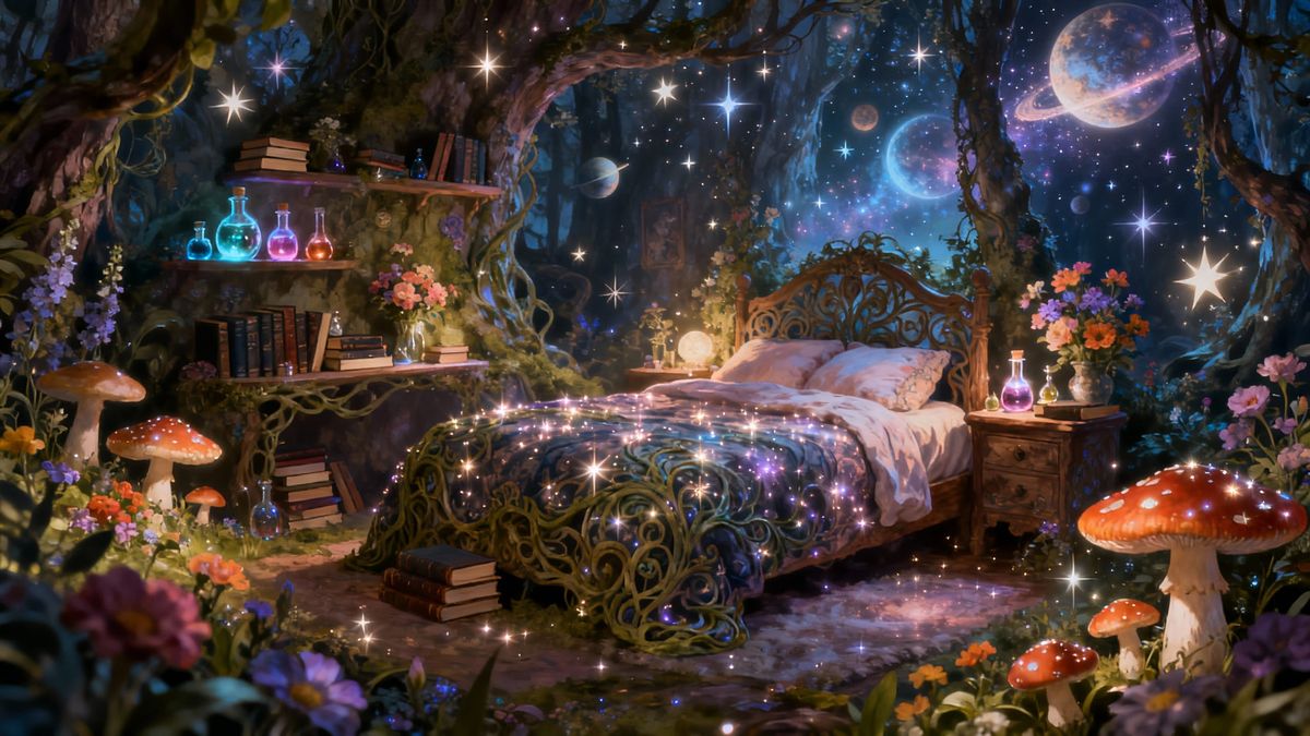 This highly detailed digital painting depicts a magical forest bedroom adorned with celestial bodies, cozy furnishings, and mystical items, rendered with smooth, sharp focus and sparkling particles.