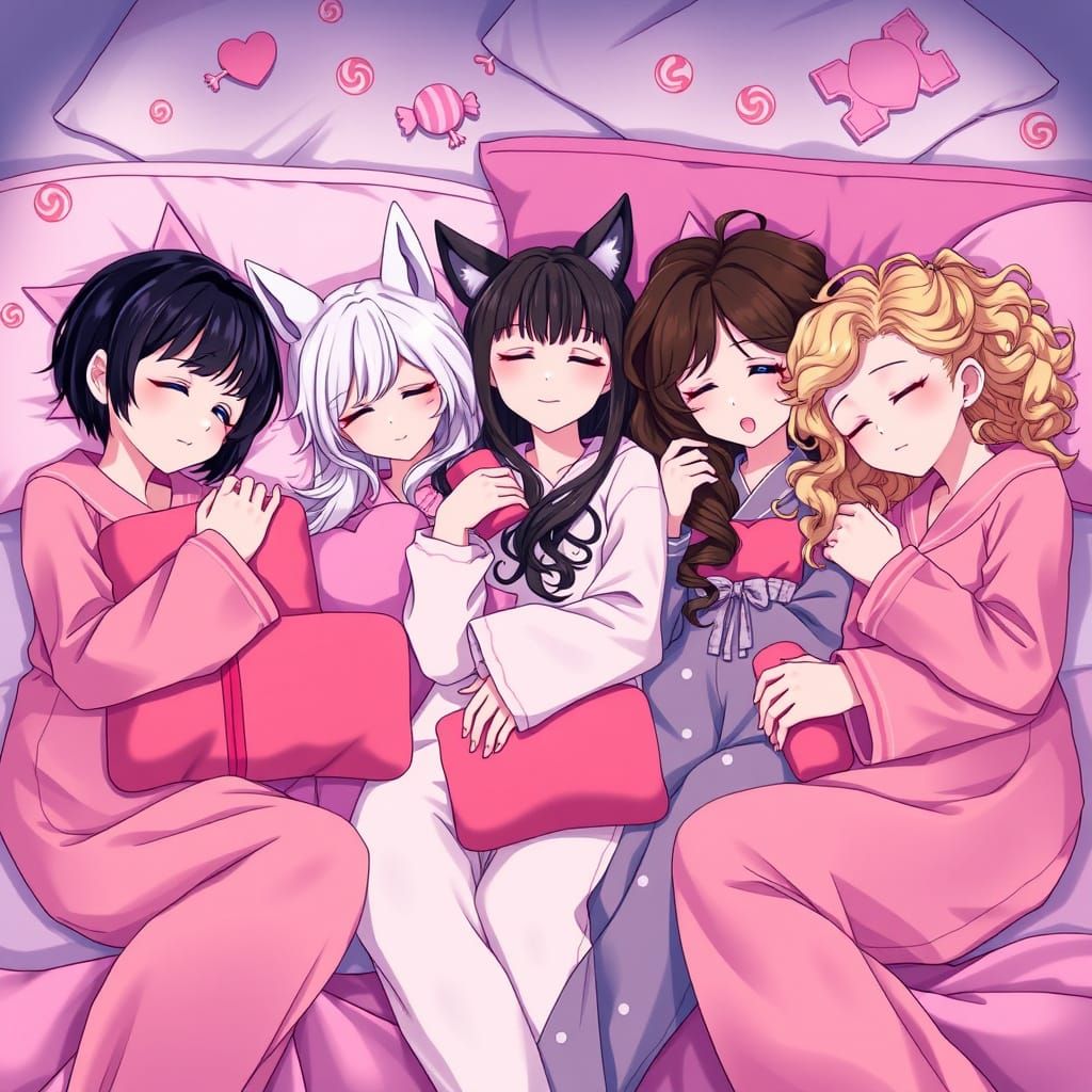 This image shows five women asleep in a candy-filled dreamscape. The characters have distinct features and rest on bright pillows, all rendered in a detailed anime style with crisp lines and cel-shaded colors.