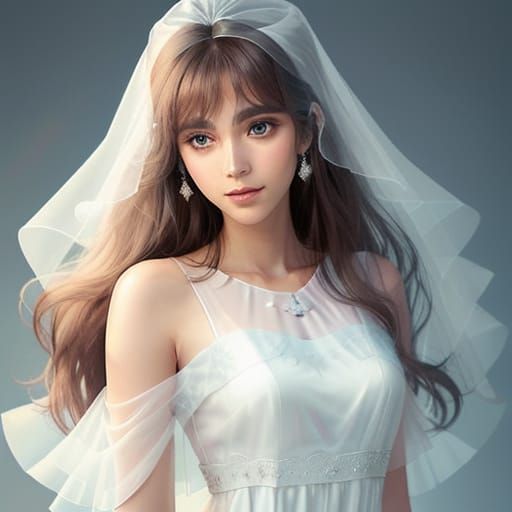 This surrealist artwork features a close-up of a woman in a sheer white dress, with her chest subtly visible. Rendered with soft focus and gentle backlighting in a pastel palette.