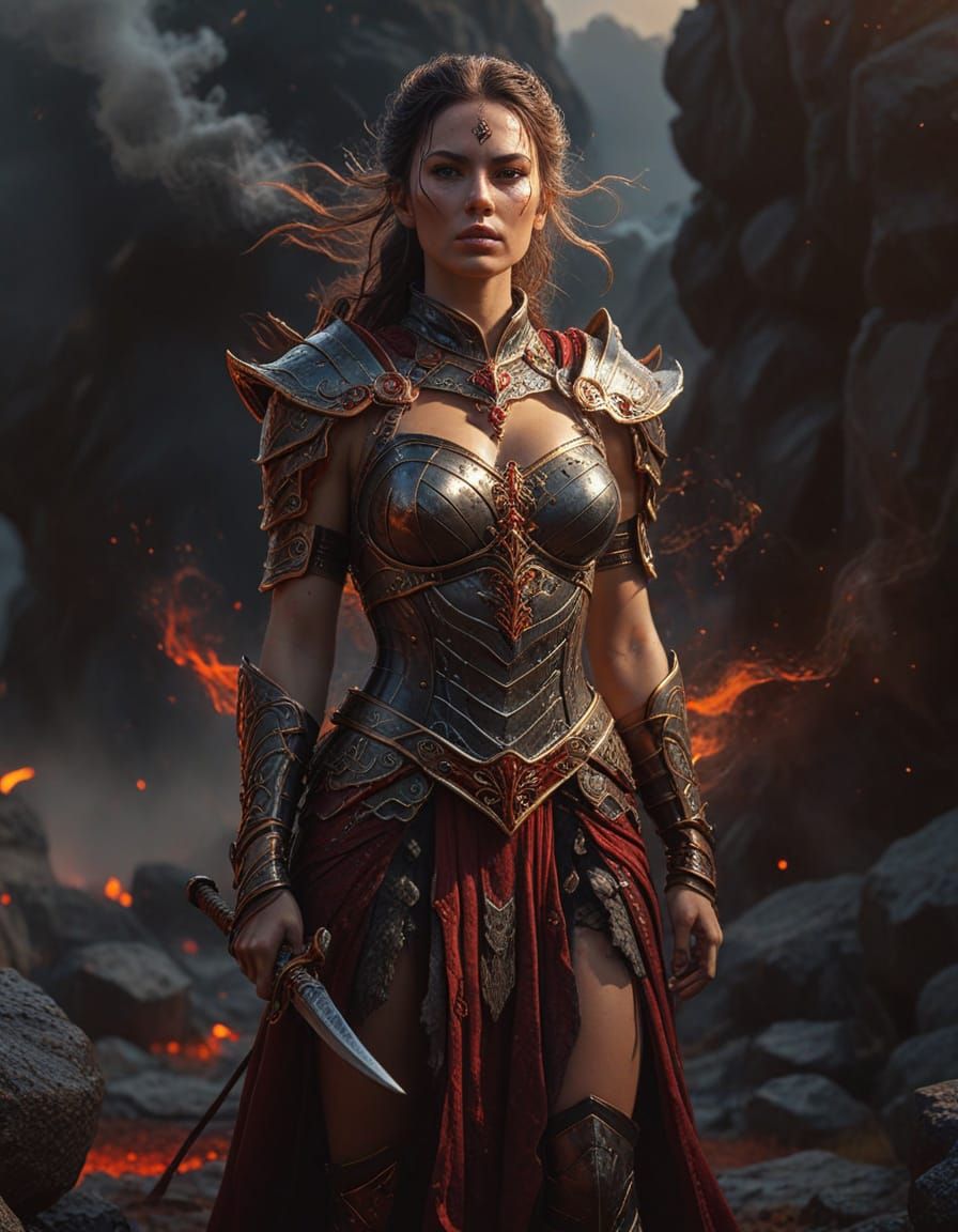 A digital painting shows a warrior queen on a misty battlefield. The close-up shot features glowing crimson armor accents with soft smoke tendrils and dramatic backlighting in golden hour colors.