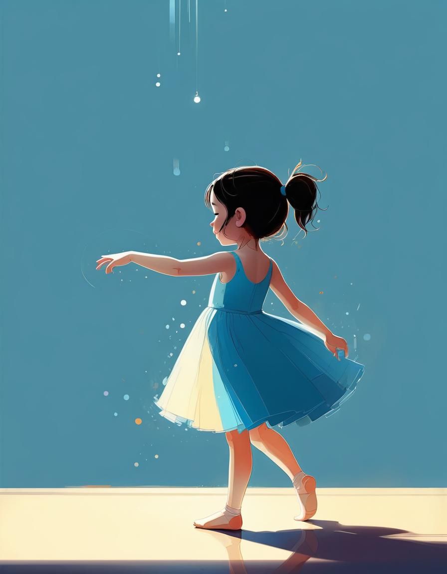 A digital illustration of a child in a dancing pose. The image features a beautiful, abstract background, cel-shaded and highly detailed in a flat, stylized design.