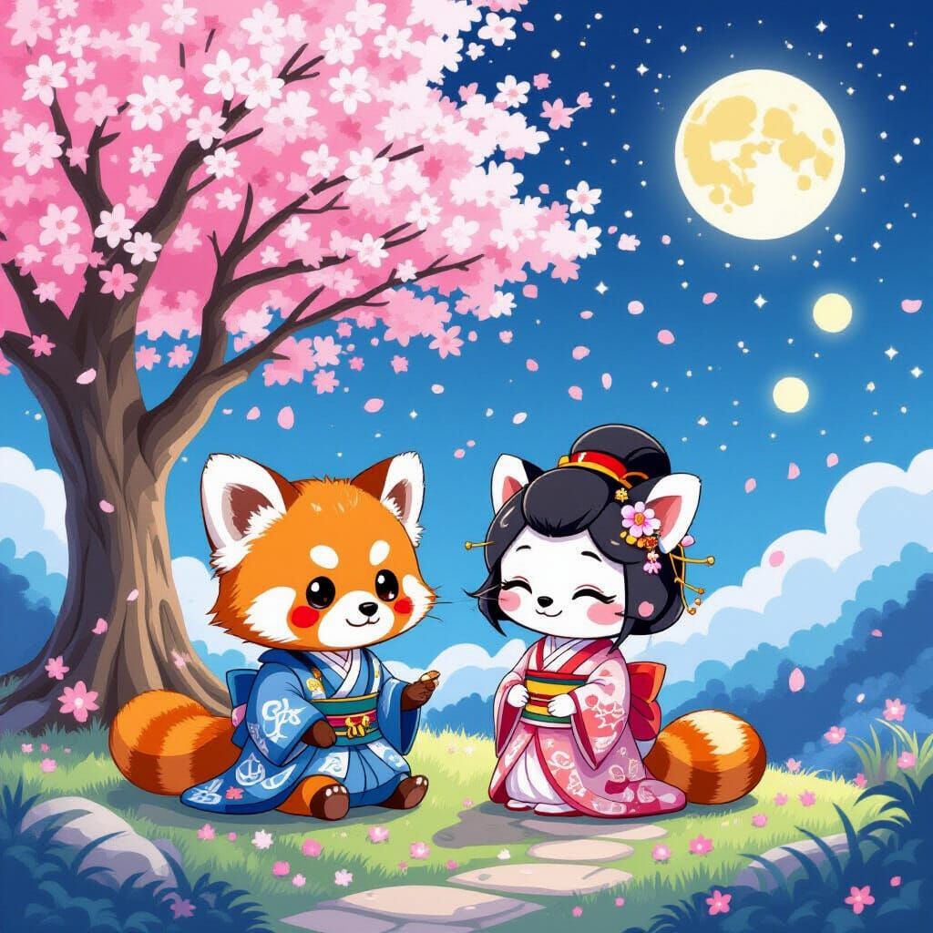 (((Chibi ))) , ((cute relaxed red pandas as a shogun and geisha under a cherry blossom tree , starry night sky with moonscape backdrop)) Cute storybook illustration on white background, Pastel crayon , Ink outlines, ultra cute details, fantasy art, trending on DeviantArt or Pixiv