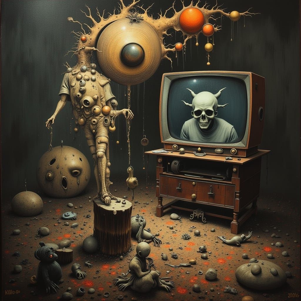 The daily news on television. Intensely surreal imagery and atmosphere, hypnagogia, paranoia, psychosis, hallucination, delusion, obsession, dissociation, clinical depression, melting, merging, liminal, we don't need no thought control, a mixture of 20th century Surrealist influences, chiaroscuro lighting, ...