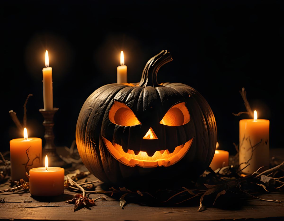 This image features a carved Halloween pumpkin with burning candles and dry foliage on a rustic wooden table, set against a black background.