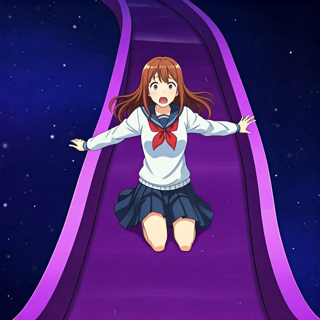 This image shows Shizuku Tsukishima on a vibrant purple slide. The artwork captures the style of "Whisper Of The Heart", conveying a sense of whimsical adventure and youthful emotion.