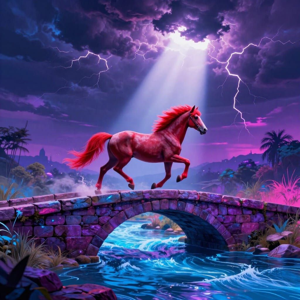A striking image of a centaur with a red mane galloping over a stone bridge. A stormy sky with a sunbeam overhead is depicted in a vibrant, retro-futuristic synthwave style.