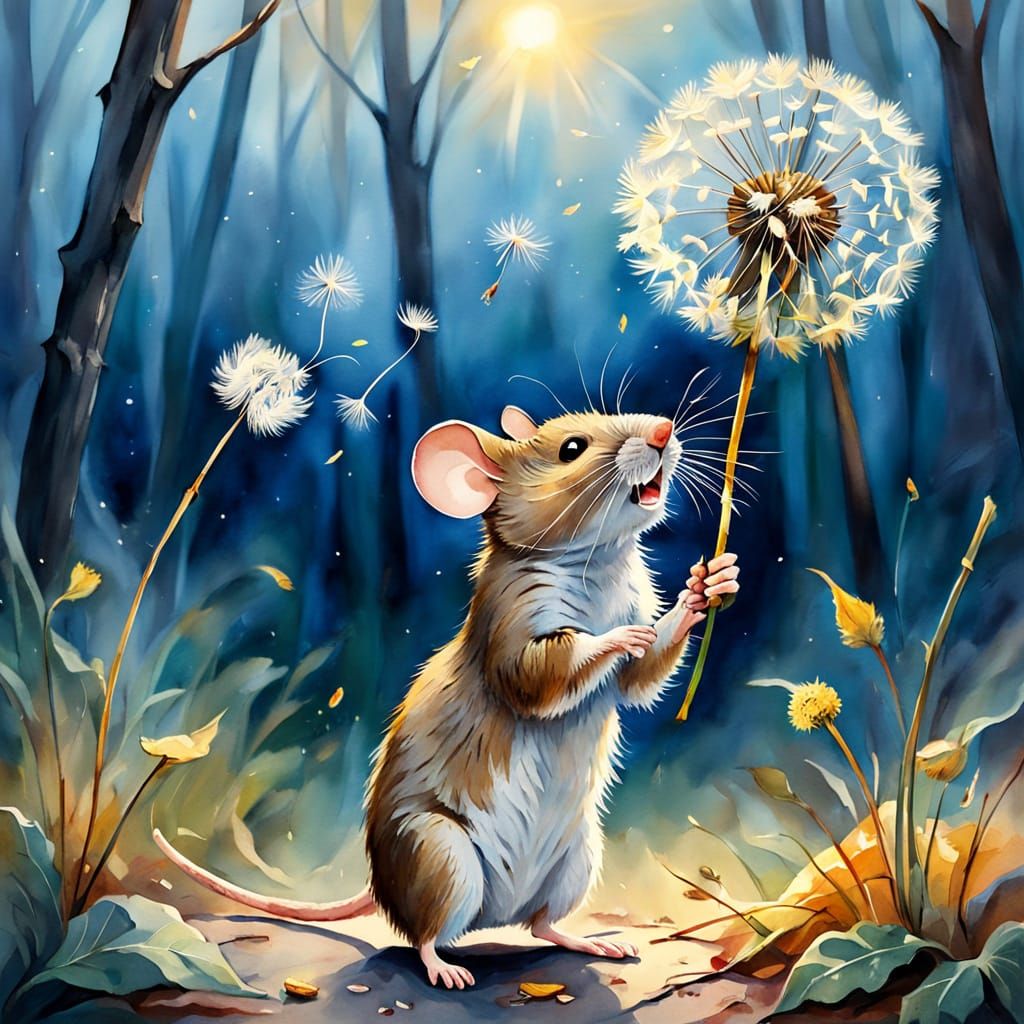 This enchanting watercolor painting depicts a mouse in a serene Autumn forest, gently blowing dandelion seeds amidst warm, golden lighting and soft, feathery textures.