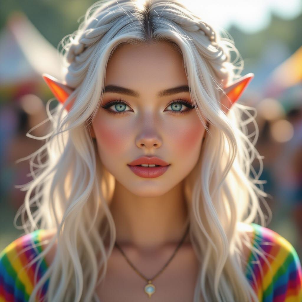 A hyperrealistic, painterly portrait of a beautiful Korean elf with striking blue eyes and flowing white hair. Set against a surreal festival backdrop with cinematic lighting. Rendered with shallow depth of field.