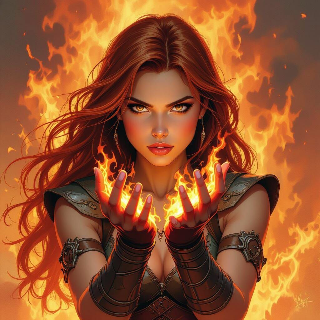 A fierce warrior girl with auburn hair and flame-touched hands stands amid fire. This image evokes heroic fantasy through detailed brushstrokes and mythical elements.