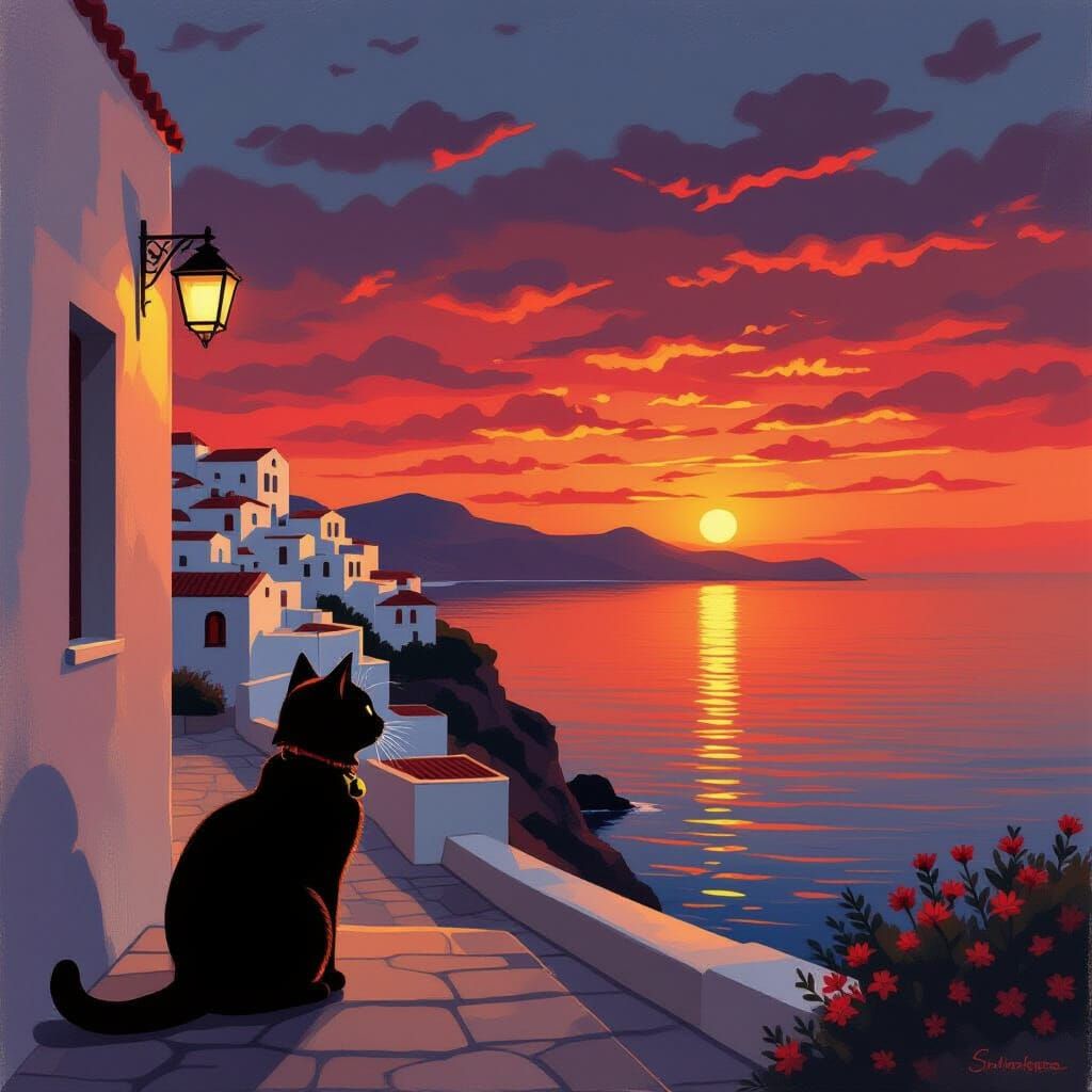 This image shows a peaceful Mediterranean village at dusk. A black cat with a bell collar sits quietly, looking at the vibrant red sunset over the calm sea. It is reminiscent of Edward Hopper's warm light.