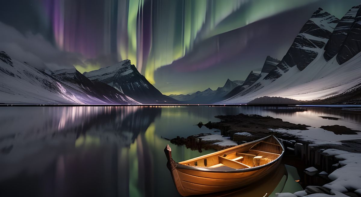 This image captures a solitary boat drifting on a tranquil fjord, with the mesmerizing aurora borealis reflected perfectly in the still water. A scene of melancholic beauty and quiet wonder.