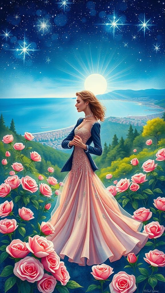 This enchanting watercolor painting depicts a slender man and woman dancing together in perfect harmony, surrounded by a lush garden filled with pink roses and a dreamlike backdrop of a blue sea, city, and forest, under a brilliant star-studded night sky with sparkling stars.