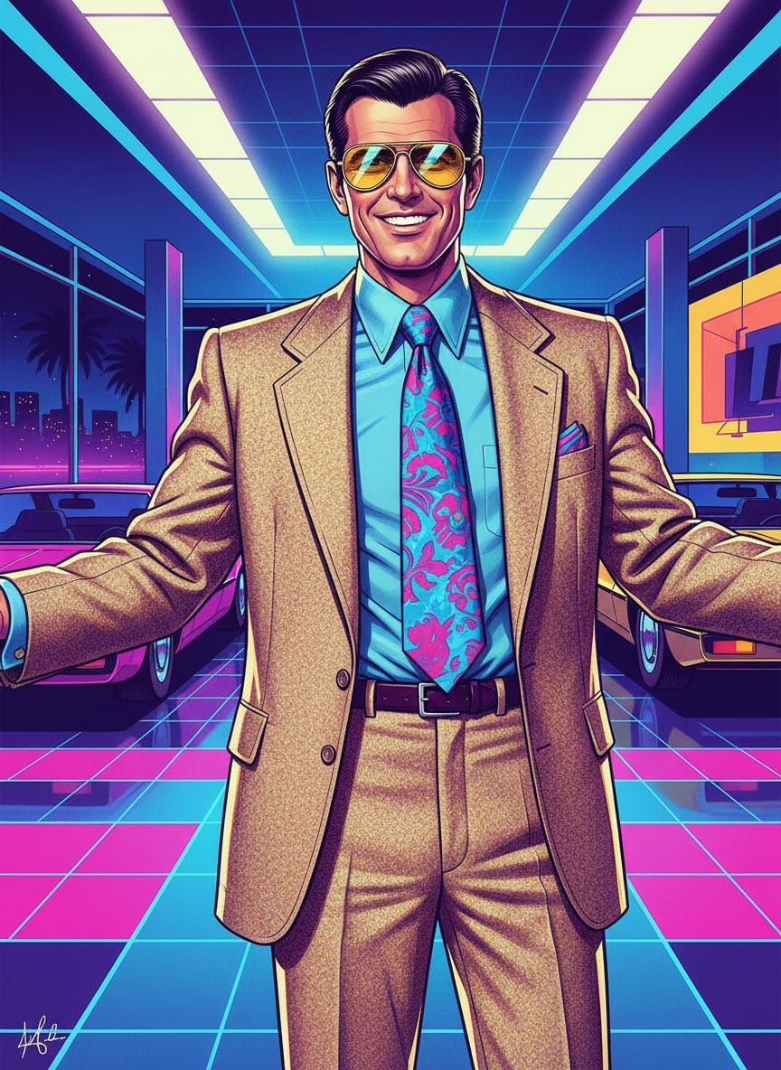 This image shows a flashy 1980s car salesman in a tweed suit and tinted sunglasses, set in a vibrant dealership showroom. The style evokes retro airbrush art and advertising illustrations with bold colors.