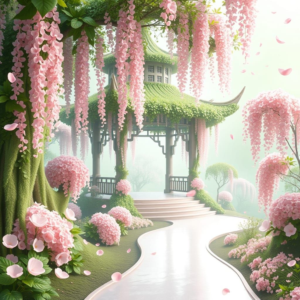 A mesmerizing, pastel-colored illustration of an enchanted garden featuring a breathtaking pagoda-like structure, seamlessly formed from lush, cascading green foliage. The architecture blends effortlessly with nature, its intricate, leaf-woven arches and curved rooftops exuding an organic elegance. Draped ...