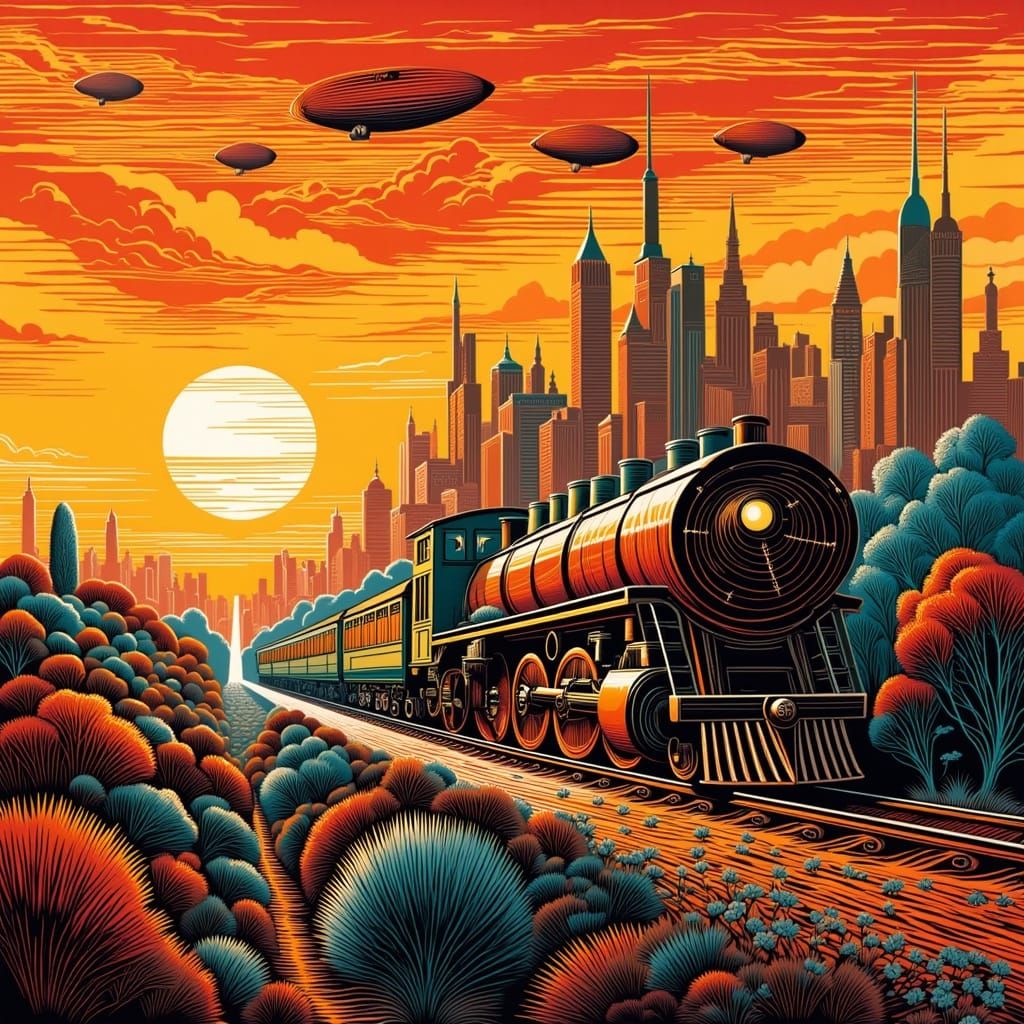 <lora:carved world flux:1.0> Trashpunk art. A polka-dotted steam engine train speeds through a futuristic cityscape. Zeppelins float overhead. Style of Syd Mead. Sunset. Beautiful orange, yellow, and red skies. Realistic style, fall colors, detailed, intricate, best quality, a masterpiece, 8k resolution. ...