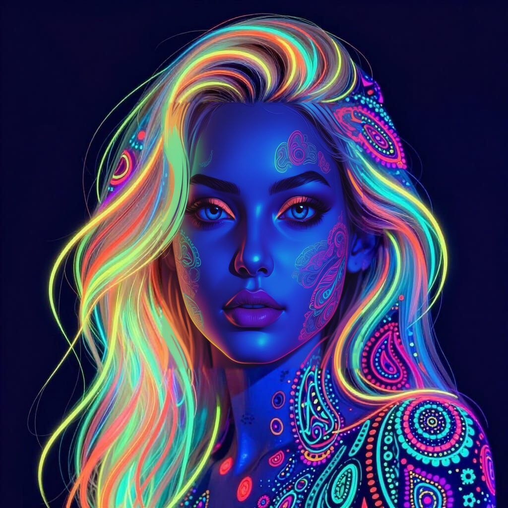 This image features a head and shoulders portrait of a blonde girl rendered in a vivid black light neon style. Intricate paisley patterns and fluorescent art influence the design, with neon outlines and shiny shadows.