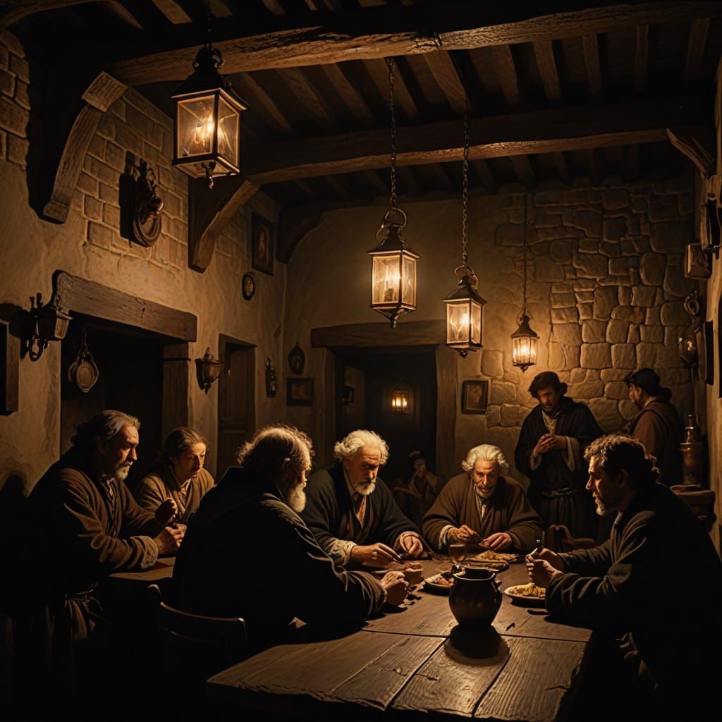 Cinematic film still of a busy medieval tavern interior. Warm lantern light creates atmosphere, highlighting patrons and a cloaked observer. Inspired by Renaissance realism and dramatic lighting techniques.