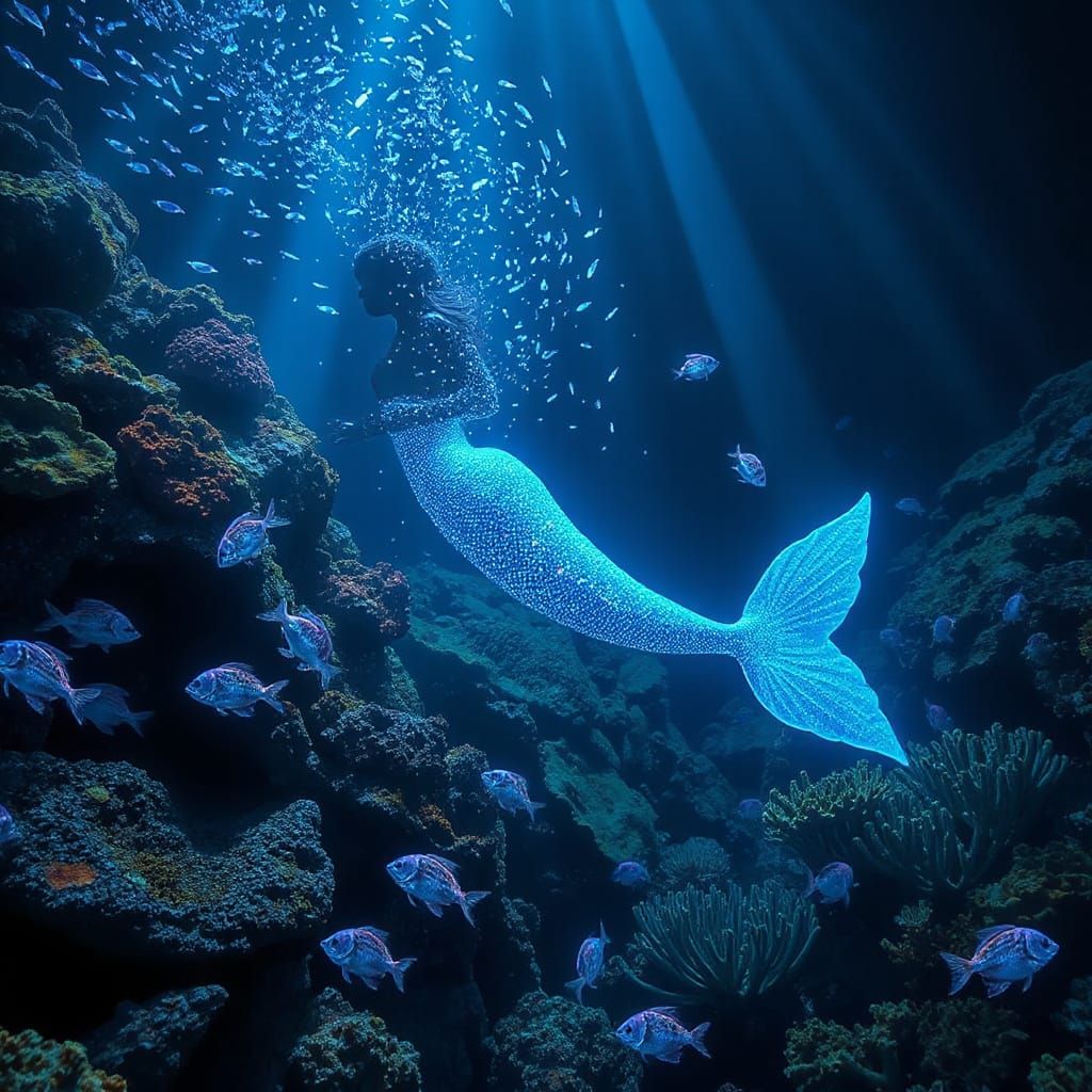 A captivating image of a mermaid swimming through a coral reef illuminated by bioluminescence. The scene evokes a magical atmosphere with vibrant colors and intricate details in a fantastical style.