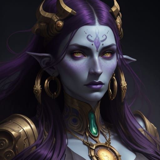 A close-up portrait of a young woman with striking features, set against a deep purple background, with intricate details and glowing purple and yellow accents, creating a dynamic and mesmerizing dark fantasy scene.
