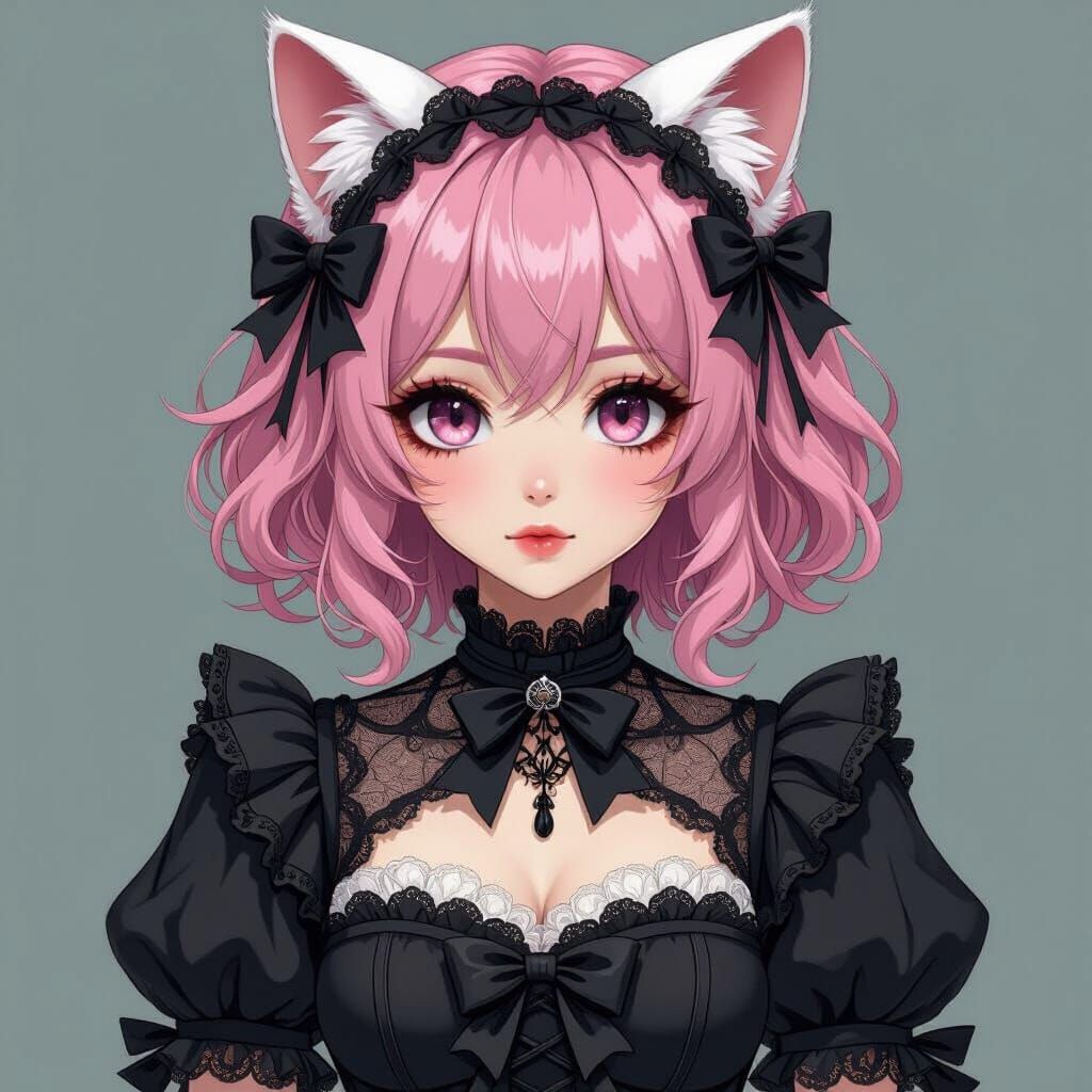 This image shows a cat girl with pink hair and black eyes wearing gothic clothing. The artwork is in a flat color digital art style with bold lines and pastel goth aesthetic.