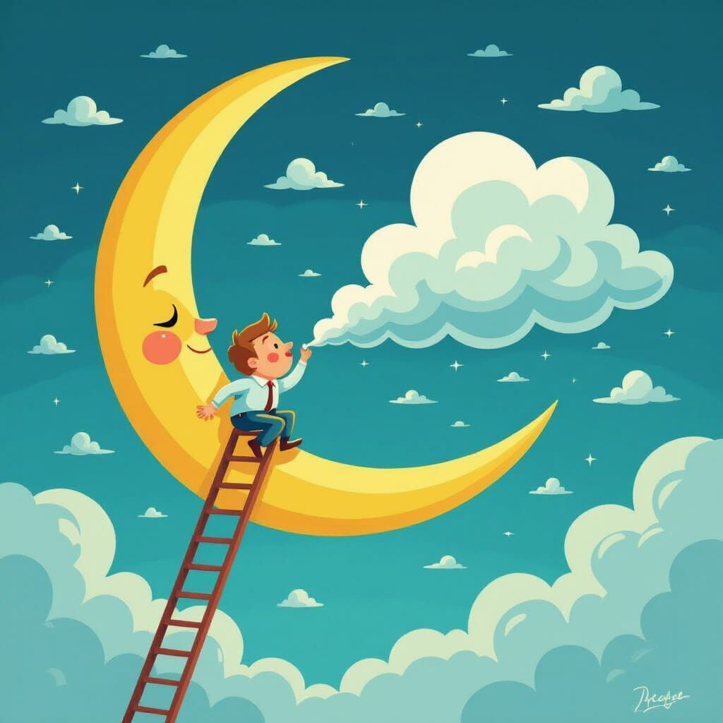 This image shows a funny character on a ladder by the moon, blowing clouds into a storm. Rendered in a vibrant storybook style with playful design and luminous lighting.