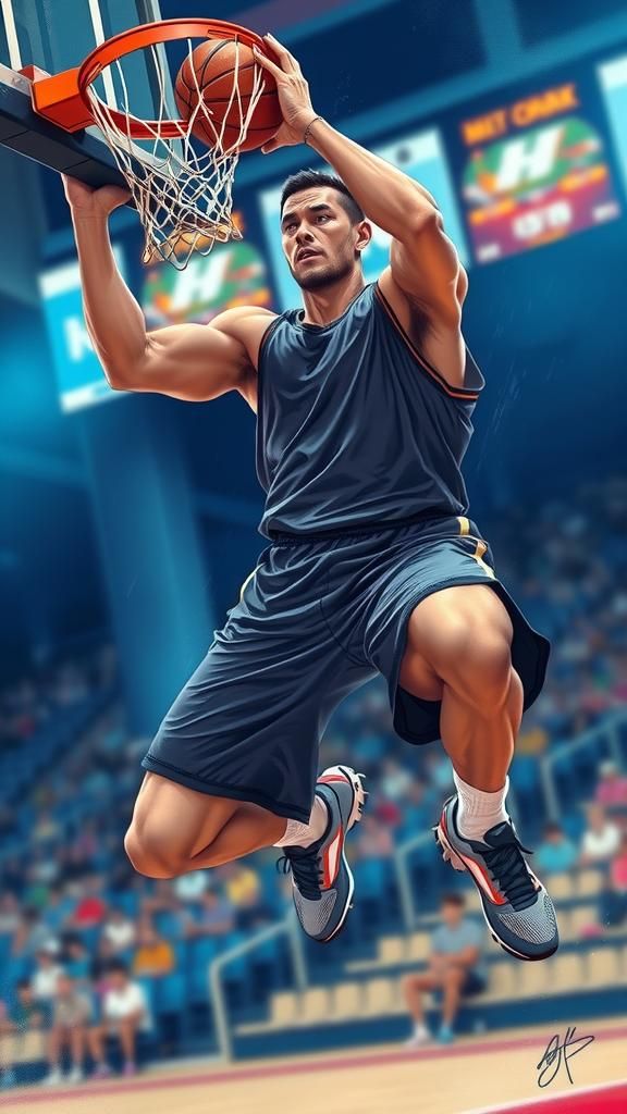 A dynamic image of a muscular basketball player performing a slam dunk. The artwork captures the explosive movement with motion blur and intense detail, in a hyper-realistic anime style.