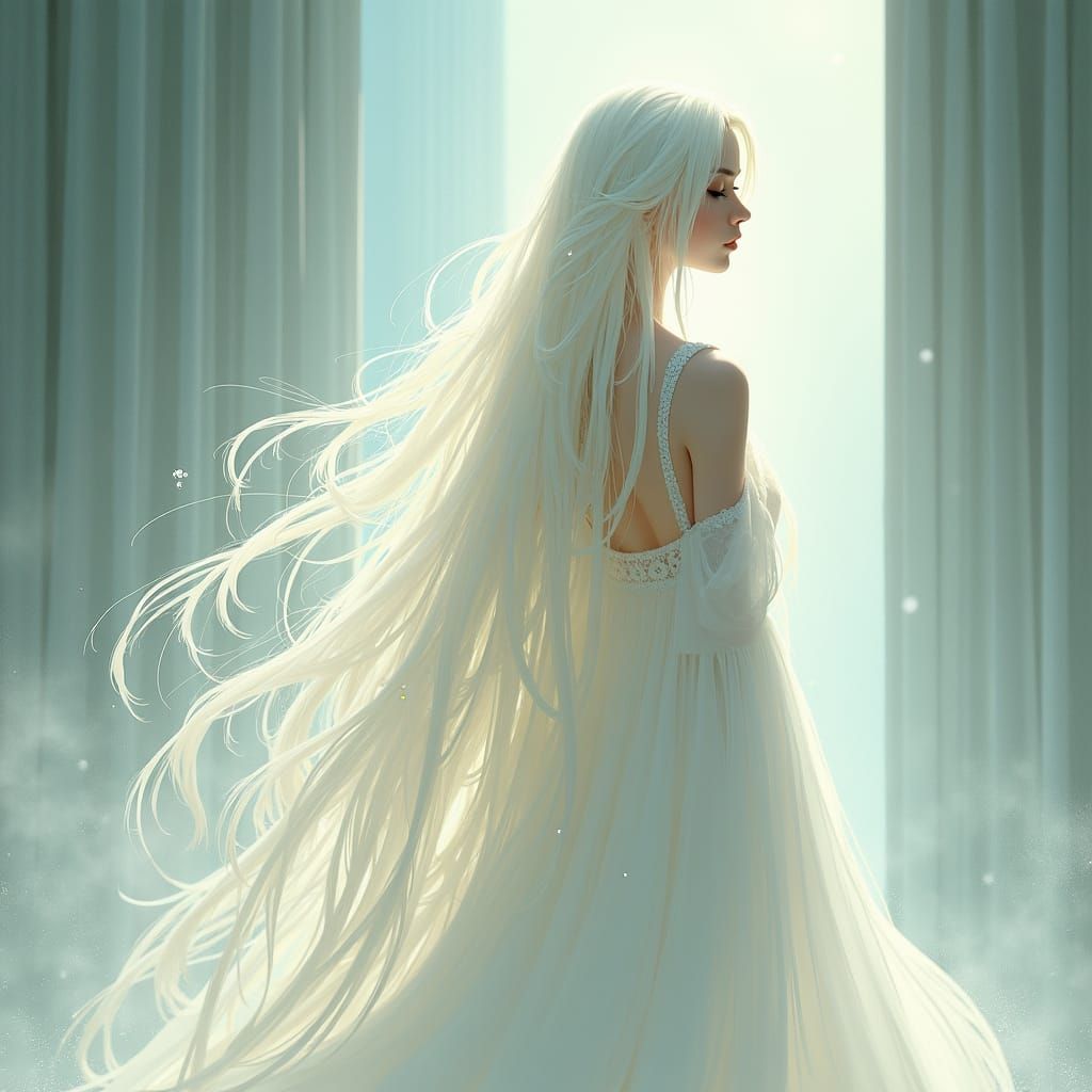 This image depicts a woman with extremely long, straight hair, cascading down her back, and wearing a flowing white gown. The scene is bathed in soft, ethereal light, evoking a dreamlike atmosphere reminiscent of Art Nouveau and surrealistic styles.