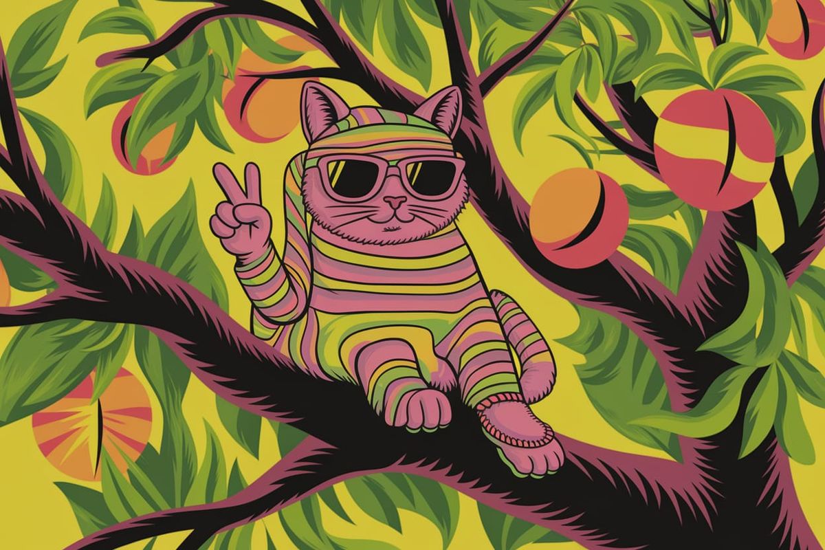 This image features a stylized cat in a peach tree, reminiscent of 1960s minimalist poster art. It showcases bold, fluorescent colors and a peace-loving, groovy aesthetic.
