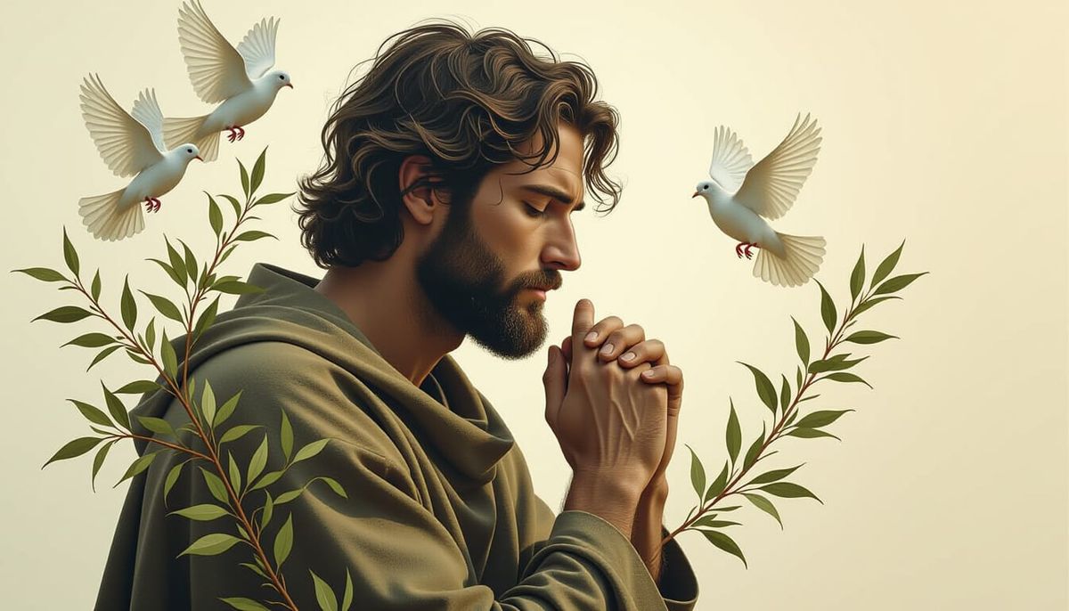 This image shows a man in deep thought, encircled by doves and olive branches, symbolizing peace and love. A double exposure effect blends realism with surrealism, using earthy tones and dramatic lighting.