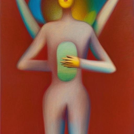 This image shows an abstract surrealist depiction of self-love and joy. The minimalist composition evokes a sense of euphoria and contentment.