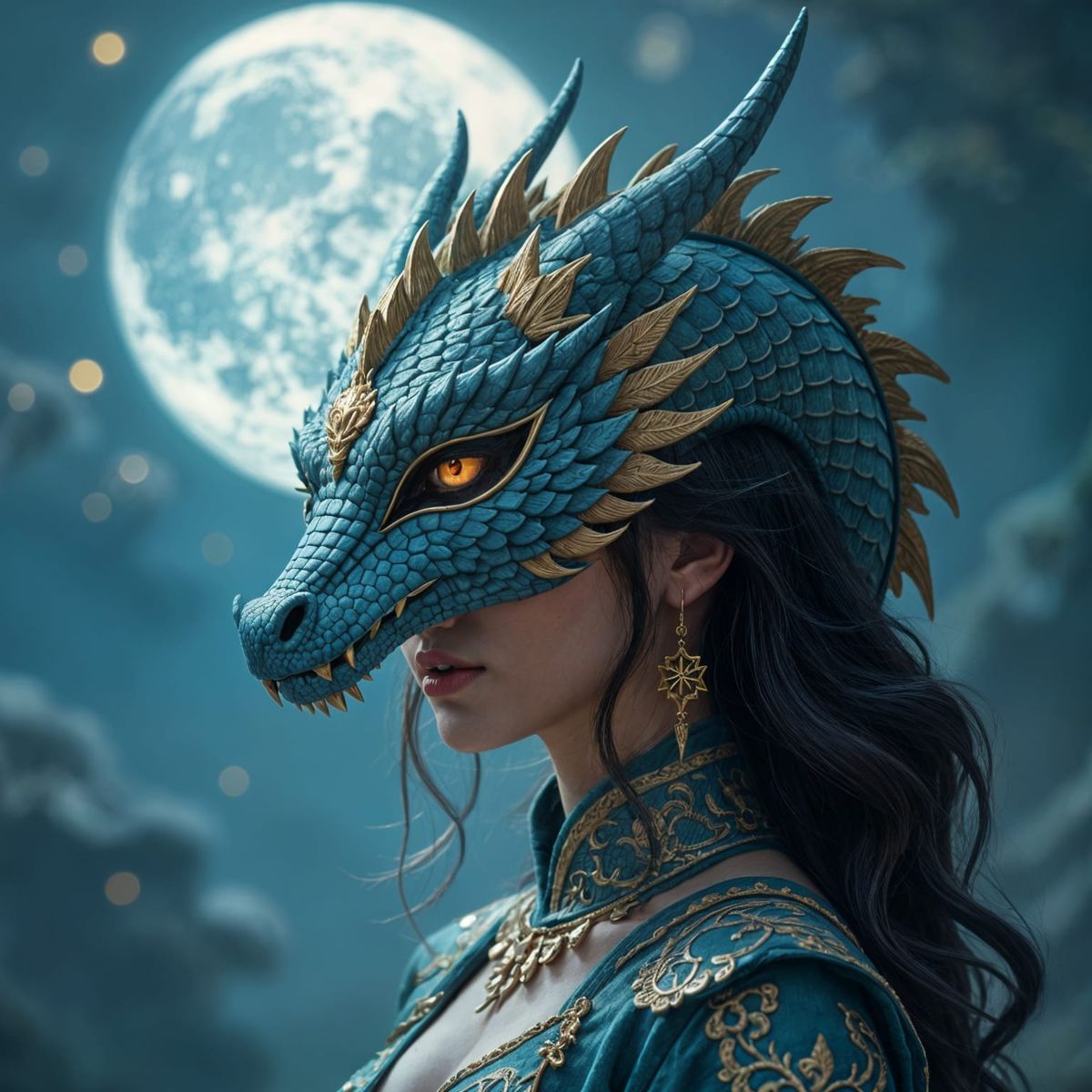 This image shows a woman wearing a dragon mask. The mask is intricately detailed, and the woman's expression is serene, creating a striking and mysterious portrait.